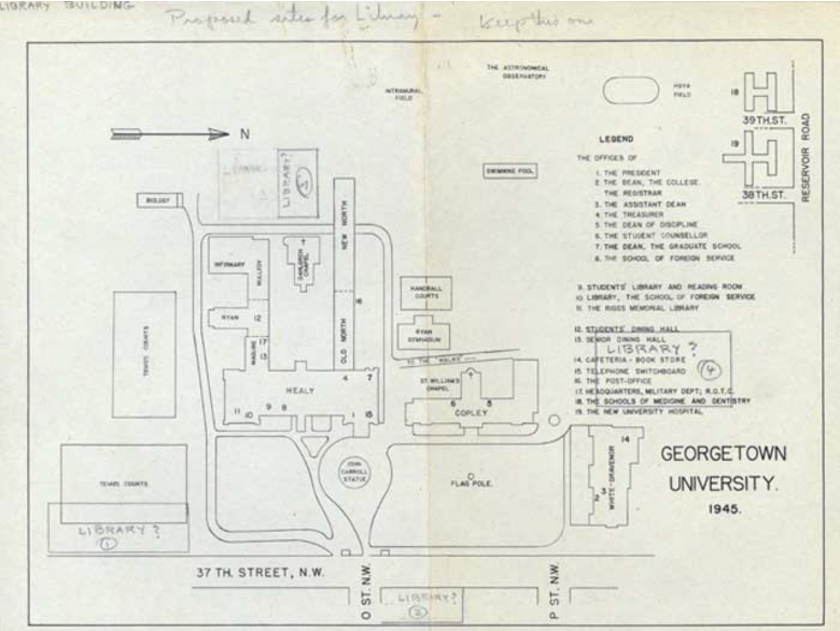 Georgetown’s campus map at the close of World War II isn’t a random starting point. It shows the campus before the Post-War building boom when enrollment massively expanded, necessitating the overhaul of the campus.