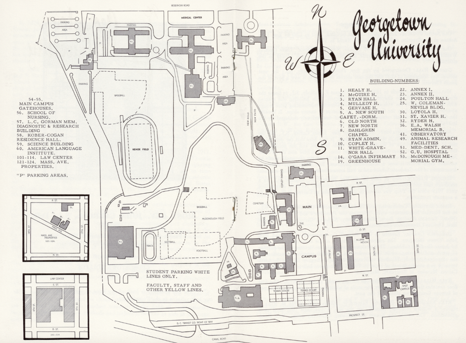 Another piece of construction that dates this map is the presence an unnamed science building (#59), which would become the modern-day Reiss. In the lower right corner, the “East Campus” also receives its first separate labeling. An interesting nuance of Georgetown was the physical separation of Georgetown College and the School of Foreign Service until the construction of the Intercultural Center (ICC) in the 80s.